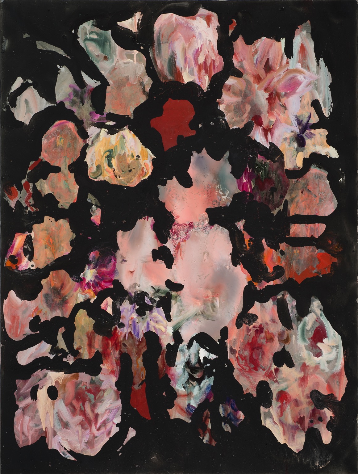 For The Disappearance, her first exhibition with Galerie Judin, Alisa Margolis has created 12 new paintings, most of which draw back upon key moments in her artistic development. Much of the work on view stems from a technique of over-painting in which Margolis creates an abstract, often black background or reuses previously abandoned canvases as bases for her expressive brushstrokes of color which converge to touch on the outside limit of being figurative while remaining in a liminal zone. A body may arise from a confluence of fleshy tones, an equine head from some swaths of grey but the figures are at most an essentialized suggestion of their full forms. These works represent a subtle but significant recent shift in paradigm from her previous series in which the black background seems to have seeped from the canvas’s four edges, slowly eating away at the vibrant color beneath.
