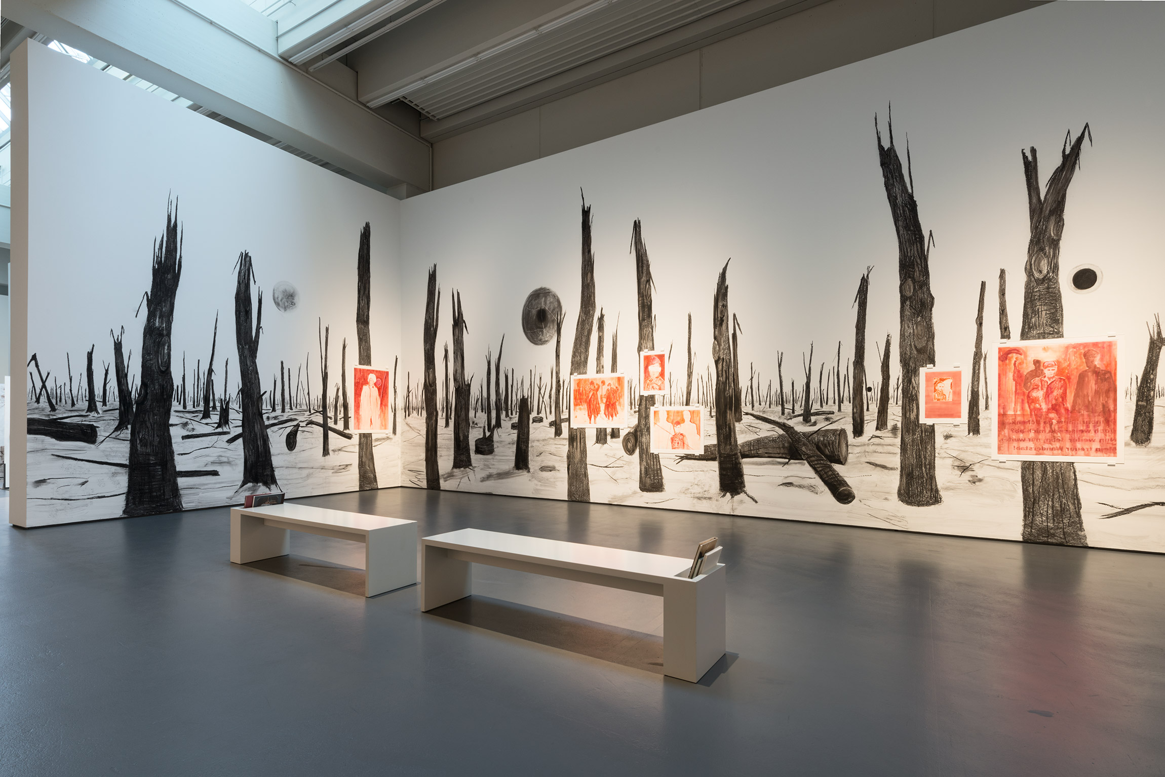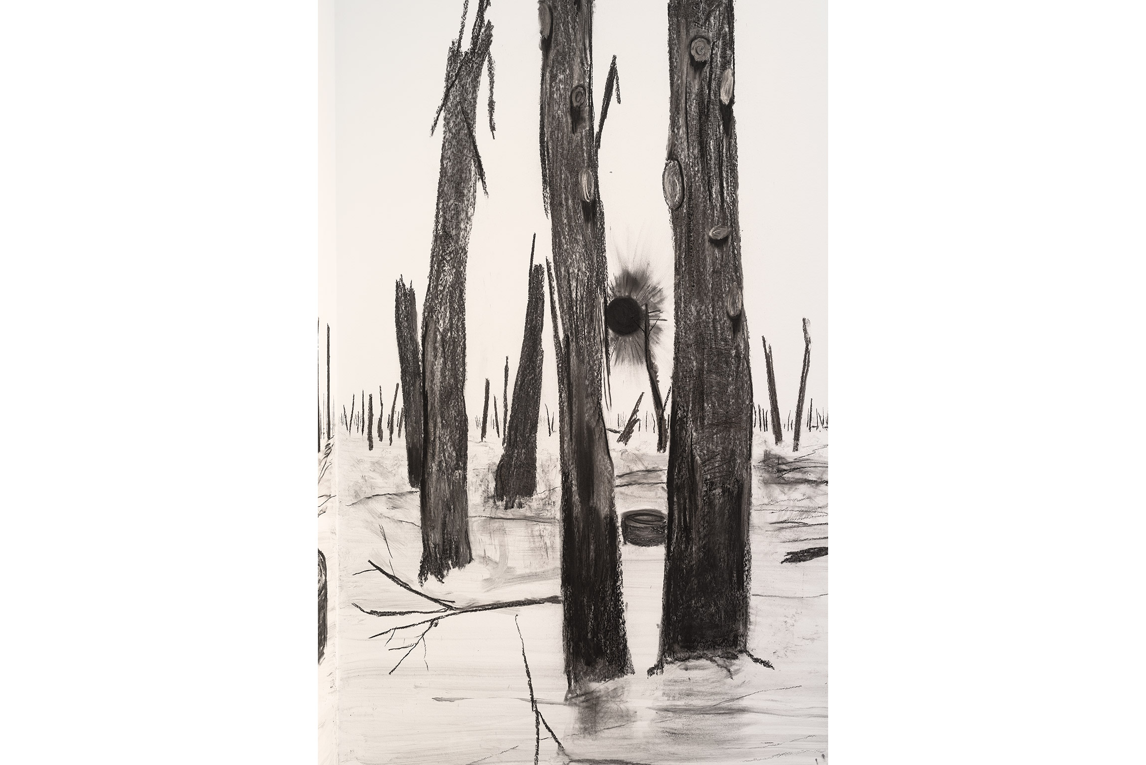 This is also true of the new exhibition, whose title “Black Snow” may at least serve as a warning to us that the forest we are about to enter in the first space is by no means an idyll. We stand between the aforementioned man-high glass steles on which Wittwer has painted delicate trees, branches, and roots, for which Caspar David Friedrich’s pencil studies of oaks served as models. But dusky suns and black snowflakes strip the scene of the nature-yearning of German Romanticism, in which the forest was a place where God could be discovered, and peace found. A solitary, large-scale charcoal drawing confirms the gloom of this artificial forest: between charred tree stumps, a group of women mourns a dead man – a composition Wittwer borrowed from Albrecht Dürer’s Glimsche Beweinung Christi (Lamentation of Christ, around 1500), but with the addition of the apocalyptic forest has rendered it devoid of any old-masterliness. It is the forest as a place God has abandoned. This devastated forest in charcoal then receives us with a vengeance in the second space, now in the form of a 360° panorama, drawn by the artist directly on the walls. Hovering over crushed and scorched trees and black suns we see portraits painted in red of young men, children actually, in uniform. Only their pale faces and white bandages shine out of the watercolor applied with a broad brush. We can tell from their oversized uniforms and caps that they are Hitler’s “Letztes Aufgebot” (last resort) – child soldiers who were drafted in the last weeks of a war lost. The grit and utter sadness on the faces of these boys, standing in the ruins of Berlin, has long been burned into our collective memory. In Wittwer’s installation, we encounter them again as Wanderers, the title of these haunting portraits, in the charred forest – which now takes on a concrete, historical dimension: it is the Hürtgen Forest in the northern Eifel, where the Germans engaged the U.S. Army, advancing from the west, in a long and harrowing battle. The topography of this area and the dense pine forest enabled the Germans, including many child soldiers, to fight a bloody standoff despite being outnumbered. The forest as ally and enemy at the same time, as a place of retreat for some and as a place of terror for others – Wittwer’s panorama tries to express all this in only two colors, black and red. Ernest Hemingway, who was on the scene as a war reporter, later put the horror in these words: “In Hürtgen they just froze up hard; and it was so cold they froze up with ruddy faces. Very strange.” Like every Swiss, Uwe Wittwer knows the Bourbaki Panorama in Lucerne, a painting of 1,000 m2, created in 1881. It shows a defeated army of the Franco-Prussian War of 1870/71, in a vast, gloomy snowy landscape. Nature and especially the forest occupy a central place in Wittwer’s oeuvre, not only in this installation. An exhibition in our gallery ten years ago was entitled Andere Orte – Wäldchen (Other Places – Small Forest.) In the autobiographical exhibition Der Brief (The Letter) in 2013, a pivotal work was called Waldstück negativ (Forest negative). It features Uwe as a boy gathering firewood with his father in an impenetrable forest. This father had spent World War II in Berlin and fled to Switzerland only in February 1945, when the Nazis were turning children into soldiers. Wittwer found the templates for the touching faces of the doomed youths on the Internet – and we learn that he has admitted not only German but also Soviet child soldiers into his forest. To this day, children fight adults’ wars in forests, albeit in Africa. Perhaps that’s why Wittwer’s installation seems so timeless.