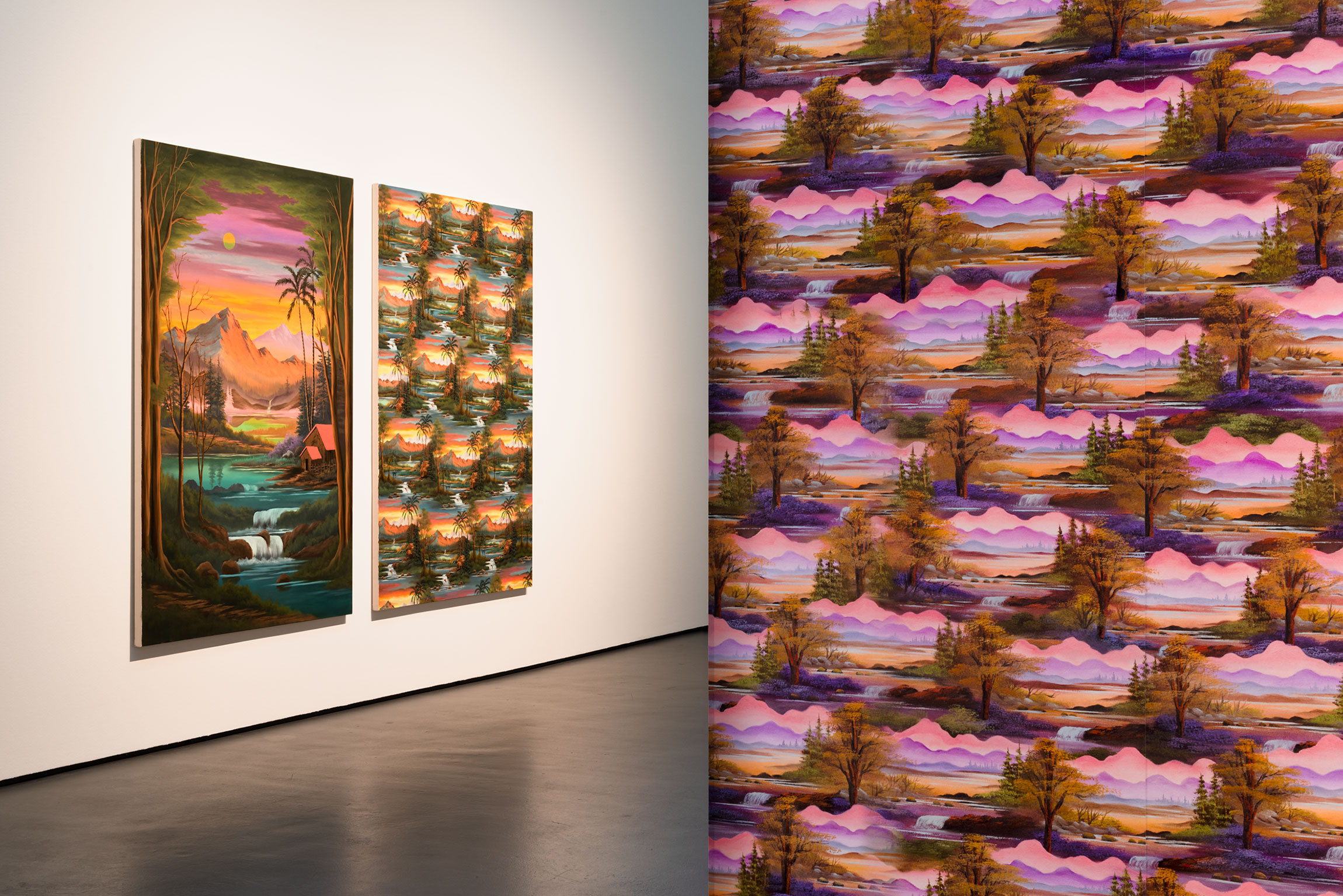Truth be told, Neil Raitt has been fantasizing about by the land of unlimited opportunities and boundless landscapes since his youth. He is equally fascinated by the wide range of artistic traditions within the relatively short cultural history of the U.S., where even Sunday painting or supposedly “naïve” art command consideration. In view of these affinities, it is not surprising that Bob Ross, the maker of the legendary TV series The Joy of Painting, became the young painter’s hero. Around about the time Raitt finished his studies, Ross’ palette of American landscapes – from the palm-studded beaches on the Pacific Coast, to the Blue Ridge Mountains in the East – starts to feature in his own works. He adopts Ross’s color schemes and style, and even his famous “happy accidents.” But he doesn’t stop at citing this mélange of patriotism, nostalgia, and kitsch. With the paintings on display, all of which were created this year, he transposes the well-known into the strange. He repeats and changes motifs and combines mutually exclusive images. Surprisingly, this creates patterns and labyrinths that are right on the pulse of the digital age. Raitt’s pleasurable repetitions are neither artificial nor lifeless. On the contrary, his compositions are wonderfully painterly, at times downright impasto. Through this “give one’s all” painting and the refraction and disintegration of the motifs, several major questions arise. Such as that of the thin line between art and kitsch. Raitt himself explained to curator Mark Gisbourne, “I like to get things as close to kitsch as possible, yet not quite crossing the line, but playing with it.” This play with our expectations in this regard, as well as the contrast between “wild” nature and civilization, results in a tense examination of Romanticism and our, often very misleading, ideas about this artistic-philosophical phenomenon. In his essay for the catalog that accompanies our exhibition, Mark Gisbourne has addressed this tension – and appropriately described Raitt’s approach as “romantic irony.”