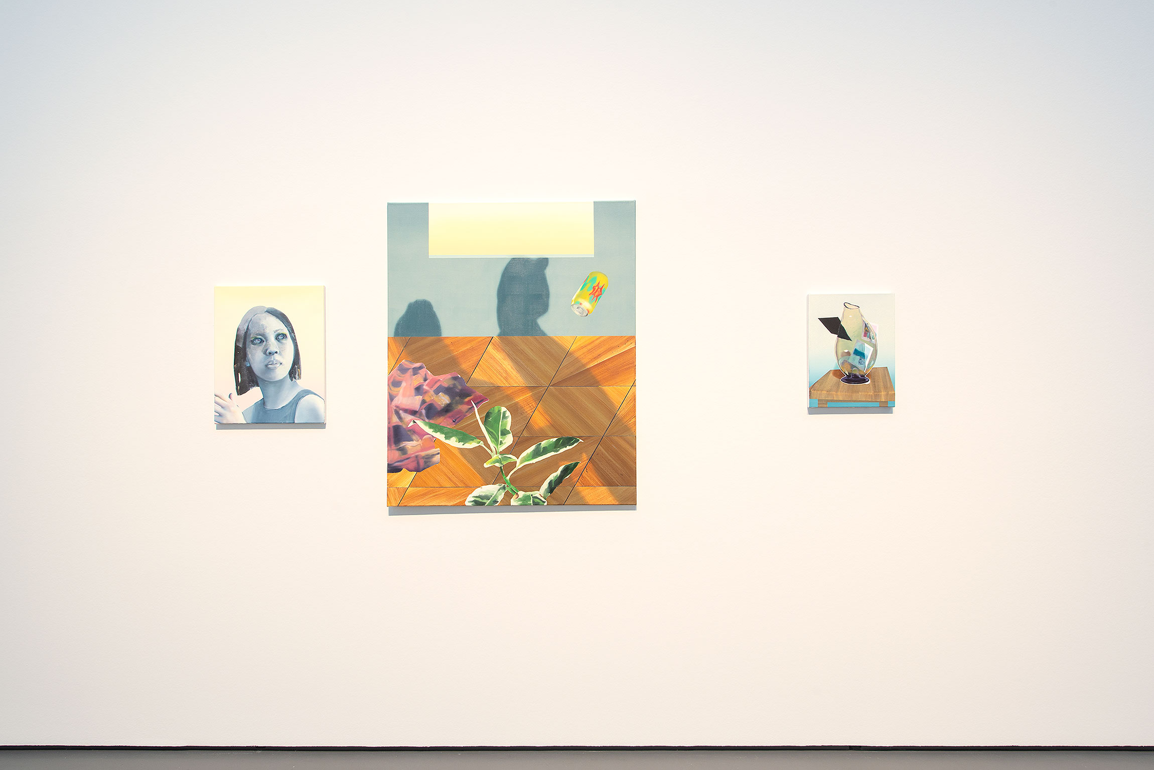 The mural is thus an early manifestation of elements characteristic of the work of this artist, who has lived and worked in Leipzig for a decade now. Akimoto’s paintings mostly show interiors and people. Mysterious narratives unfold in them, eluding straightforward readings and always remaining enigmatic. It comes as no surprise that the artist draws on photoshopped collages for the larger compositions. The trompe l’oeil that preludes the exhibition, also digitally generated, thus also reveals the importance of digital technologies for Akimoto’s practice. In addition, the wall work gives ample space to ornamental elements, which also play a special part in the artist’s imagery. The repeat pattern in the wallpaper, for example, is a tachist brushstroke that keeps reappearing in Akimoto’s compositions and which alludes to another playing field in her work. Time and again, Akimoto walks the fine line between figuration and abstraction, further potentiating the mystique that pervades her work. Indeed, it was the exploration of this very potential of figurative, narrative painting and its peripheries that drew her to Leipzig in the first place.