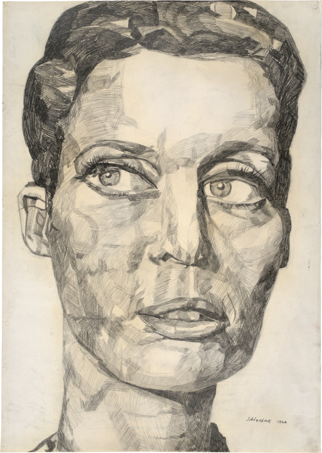 In 1964 Schönebeck broke through to a new monumental style of painting. That year he began to transform mass media photographs of politicians, poets, and artists who sympathized with variants of socialism into quasi-religious emblems. These likenesses and the few large scale drawings that followed them attest to Schönebeck’s struggle to find a middle way between art made for the capitalist market and work harnessed to political ends. Disinclined to turn his back on either of these aesthetic traditions and unwilling to compromise the moralistic edge of his art, Schönebeck decided in 1967 to stop painting. Nevertheless, since the early 1980s curators, aware of the significance of his work, have included his work in almost every important survey exhibition of postwar German art presented internationally. His art was ahead of its time, and its meaning continues to endure, especially for a younger generation of artists.