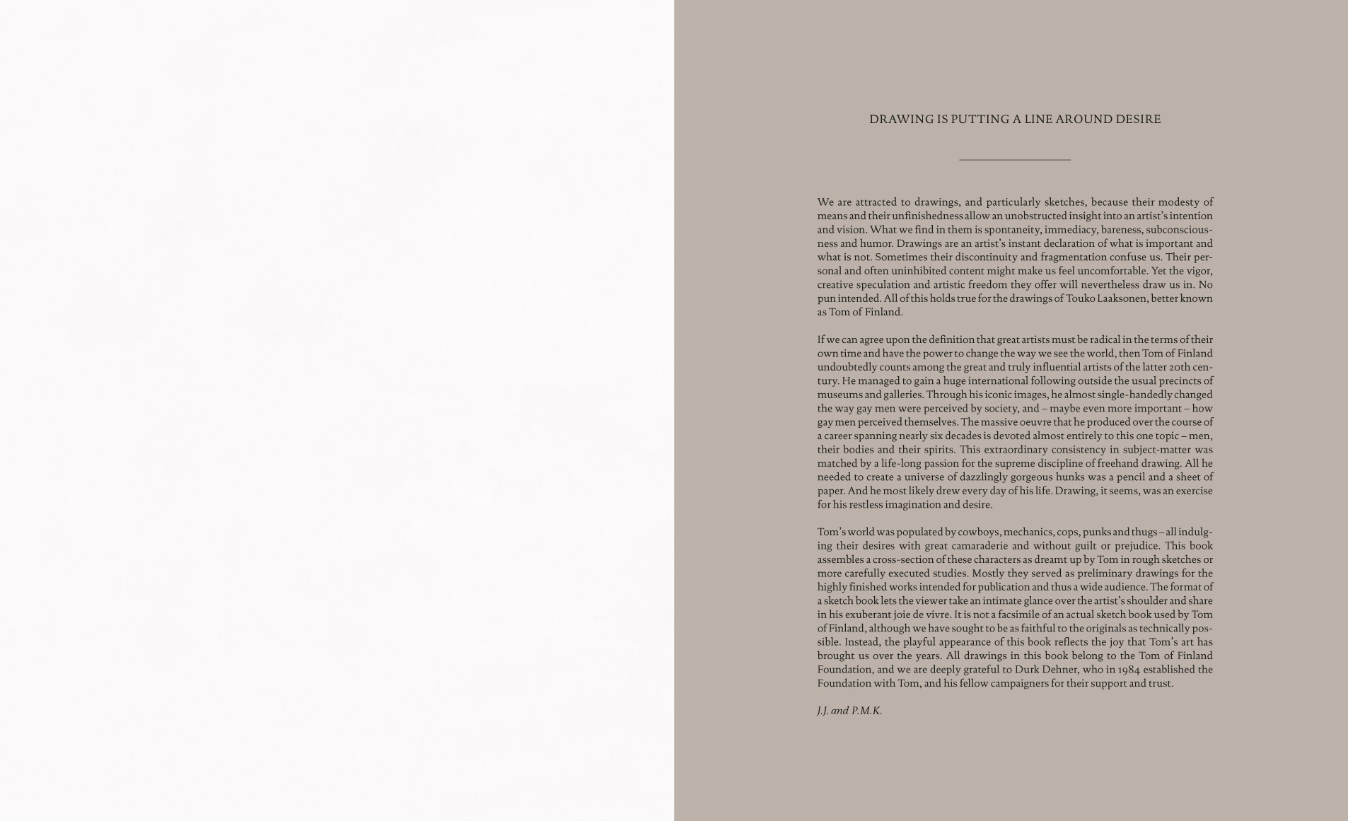 Tom of Finland undoubtedly counts among the great and truly influential artists of the latter 20th century. Through his iconic images, he almost single-handedly changed the way gay men were perceived by society, and – maybe even more important – how gay men perceived themselves. The massive oeuvre that he produced over the course of a career spanning nearly six decades is devoted almost entirely to this one topic: men, their bodies, and their spirits. This extraordinary consistency in subject-matter was matched by a life-long passion for the supreme discipline of freehand drawing. All he needed to create a universe of dazzlingly gorgeous hunks was a pencil and a sheet of paper. And he most likely drew every day of his life. Drawing, it seems, was an exercise for his restless imagination and desire. Tom’s world was populated by cowboys, mechanics, cops, punks and thugs – all indulging their desires with great camaraderie and without guilt or prejudice. This book assembles a cross-section of these characters as dreamt up by the artist in rough sketches or more carefully executed studies. Mostly they served as preliminary drawings for the highly finished works, many of which were intended for publication. The playful format of an imaginary sketch book lets the viewer take an intimate glance over the artist’s shoulder and share in his exuberant “joie de vivre.”