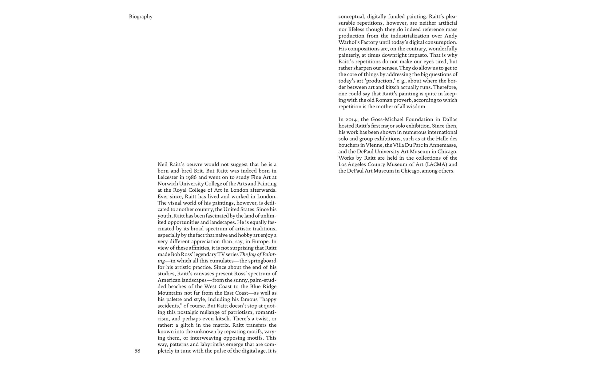 The paintings of Neil Raitt (*1986) would not suggest that he is a born-and-bred Brit given that all of his work is USA themed – inspired by the land of limitless landscapes and opportunities. The American tradition of “Sunday painting,” namely Bob Ross’ legendary TV series, served as a springboard for his artistic practice. Raitt transfers the well-known into the unexpected by repeating motifs, varying them, or interweaving contradicting motifs to create conceptual paintings. By adopting Ross’ approach, Raitt presents his own concept of Romanticism and raises questions on our distinction between art and “kitsch.” The exhibition catalogue presents the artist’s newest body of work, contextualized by a revealing essay by British art historian Mark Gisbourne.